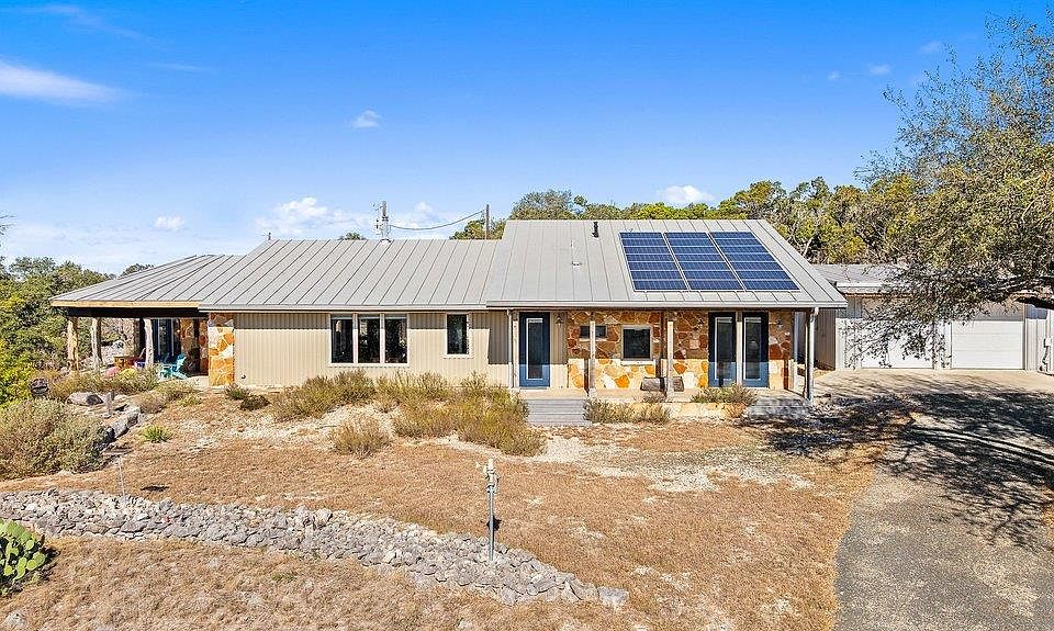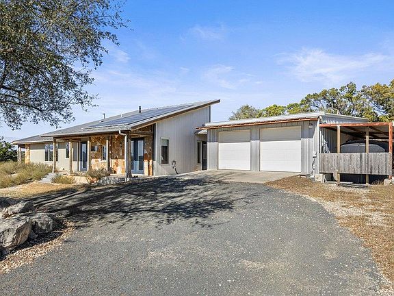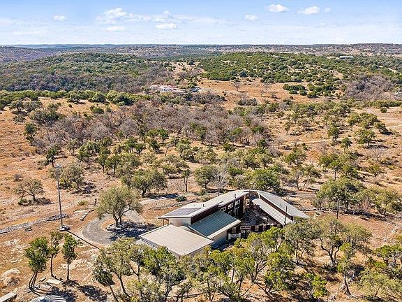 Perched at high elevation on 39 acres, this property offers privacy, long-range Hill Country views, rare live water, and potential off-grid capability—all just a short drive from Kerrville. This highly improved ranchette features a custom 2,277 sq ft hilltop home with guest quarters, thoughtfully designed for efficiency, comfort, and year-round living. The main home and guest house are connected by a large covered breezeway that opens into a beautifully landscaped, privately fenced courtyard—ideal for outdoor dining, entertaining, and stargazing. The land is anchored by approximately 400 feet of improved, dammed live-water Tomas Creek, owned on both sides. A constructed dam creates a deep fishing and swimming hole. A natural spring feeds the system in non-drought years. Water and energy infrastructure set this property apart. All structures feature rainwater collection totaling 29,000 gallons of storage, supported by a multi-stage filtration system delivering high-quality water. A well, drilled in 2016 with an initial flow test of 35 GPM, currently serves irrigation and is plumbed for residential use if desired. Solar panels and a wind turbine provide efficient power generation, offering strong off-grid or low-utility-cost potential. A 1,080 sq ft barndominium across the valley provides shop and equipment storage, recreation space, three air-conditioned guest rooms with a 3/4 bath, and also benefits from rainwater collection. The property lies within a 369 acre game-fenced community shared by only four owners and accessed via an electronic gated entrance. Native and exotic wildlife are abundant, and the property maintains an agricultural tax exemption through wildlife management. Extensive land improvements—including selective clearing, native planting, creek enhancement, and trail maintenance—create a polished yet natural Hill Country setting. Most high-end furnishings convey, and select equipment for ongoing maintenance is available by separate negotiation.