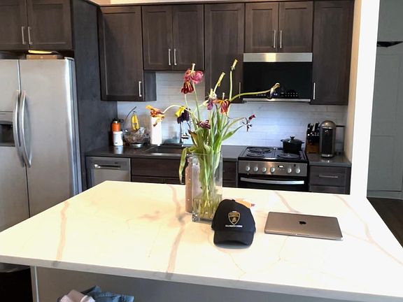 Beautiful 1 bedroom apartment designed with high end finishes. The kitchen is fitted with custom cabinetry and quartz countertops featuring a center island. Bathrooms designed with walk in marble shower with glass doors. Enjoy a stunning view of the city with floor to ceiling windows and a private balcony that spans the living room and bedroom. Living room windows fitted with room darkening shades that block 97% of unwanted light and glare providing you with comfort and privacy. Bedroom windows fitted with blackout shades that block 99% of incoming light for a restful night's sleep.Washer/Dryer in unit.