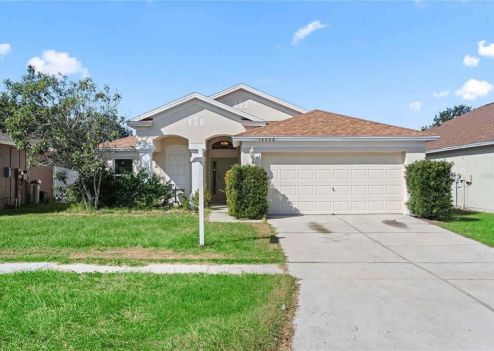 Welcome home to this bright and sunny 4-bedroom, 2-bathroom residence offering 1,665 sq. ft. of living space in the highly sought-after South Pointe community. Featuring high ceilings, dark wood laminate flooring, and a nicely updated kitchen with granite countertops, stainless steel appliances, and a stylish tile backsplash, this home blends comfort and functionality. Enjoy the Florida lifestyle on the huge screened lanai complete with a ceiling fan, perfect for relaxing or entertaining while overlooking peaceful conservation views. The spacious master suite includes double sinks, a walk-in closet, and plenty of natural light. Additional highlights include a 2-car garage, no leasing restrictions, and low HOA fees with no CDD. The home needs just a few cosmetic updates—mostly paint—but offers tons of potential and is priced to sell. Residents of South Pointe enjoy outstanding amenities including two community pools, a clubhouse, a playground, a basketball court, and walking trails. The neighborhood is ideally located near I-75, US-301, shopping, dining, top-rated schools, hospitals, downtown Tampa, Tampa International Airport, and Florida’s award-winning beaches.