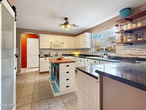 Stunning two-story home in the heart of El Mirage, AZ! This beautifully updated property offers 3 spacious bedrooms and 2.5 baths, plus bonus/flex room (w/closet), perfect for any growing family or those who love to entertain. As you approach, the inviting curb appeal sets the tone, with a charming front porch and mature landscaping. Step inside to discover an open and airy floor plan filled with natural light. The expansive living room and dining area flow seamlessly, featuring nicely appointed engineered hickory wood flooring that enhances the modern yet cozy aesthetic. The renovated kitchen is a standout, boasting new cabinets, open shelving, a large butcher block island, and a stylish backsplash that ties the space together beautifully. Step outside to your private oasis featuring a saltwater pool, perfect for cooling off in the Arizona heat, and a fire pit for cozy evenings. The backyard also offers multiple covered patios, a built-in bar, and a grill area, making it ideal for entertaining. Practical upgrades include a newer water heater (2020) and newer AC unit installed in 2020, a leased Solar system (only $139/month, transferable) installed in 2016, and a Nest thermostat adding energy efficiency to this already incredible home. Conveniently located near shopping, dining, and excellent schools, this property is the perfect blend of style, comfort, and functionality. Don't miss your chance to make this desert gem your home!
