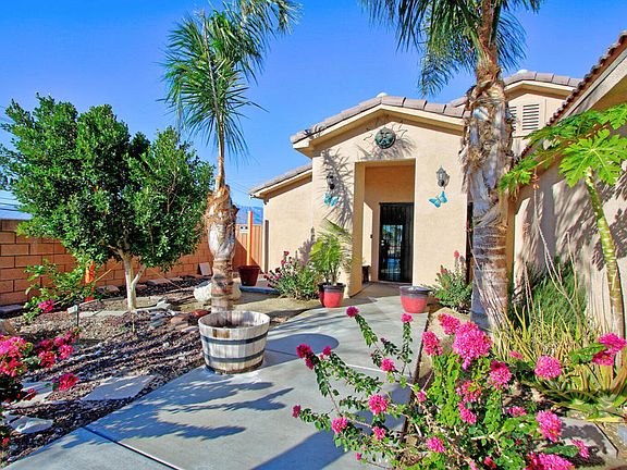 Welcome to The Desert Lifestyle! This 4 bd, 2 ba beautiful newer home was built on 2018 with 1,650 sqft, sits on an elevated lot. The front yard with professional landscaping designed invites you to enter into the impressive open floor plan with vaulted ceilings, and nice tile flooring throughout. Living room combined with dining area leads you towards the delightful kitchen featuring nice granite countertops, backsplashes, and abundant cabinetry. Master bedroom features walk-in closet, granite counters, and slided door. Step outside to your private oasis, dive into the tranquility of the backyard meticulously designed with rocks and palm trees. Two cars garage, very calm neighborhood. Enjoy the amazing mountain and city views. Desert Hot Springs is conveniently located minutes away from Hwy 1-10, Palm Springs Airport, Nice restaurants, casinos, and surrounded Desert Cities. This gems offers Solar Panels to avoid high electricity bills during summer. No HOA, you own the land.