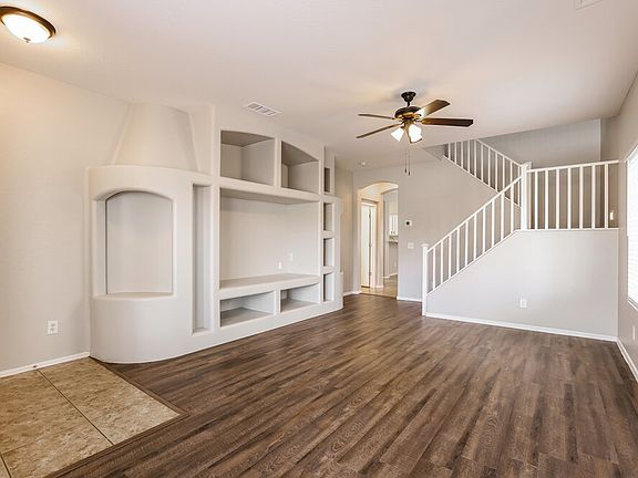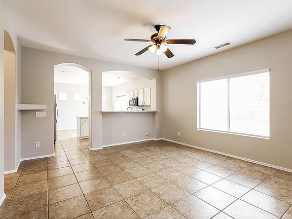 There's a lot of style in this four-bedroom, two-and-a-half bathroom rental home in El Mirage, Arizona. A two-car garage allows for easy parking. The living room has a ceiling fan, vinyl plank flooring, and exceptional built-in shelves with ample room for books, photos, and electronic gadgets. A gorgeous kitchen and dining room combo has beautiful lighting features, stainless steel appliances, a large pantry, and a sliding door to the patio in the fenced backyard. You'll also love the main bedroom, which features a ceiling fan, two backyard-facing windows, and doorless entry to the en suite bathroom with a walk-in closet. Additional spaces, including a loft and family room, provide multi-purpose areas. Arrange a tour today.