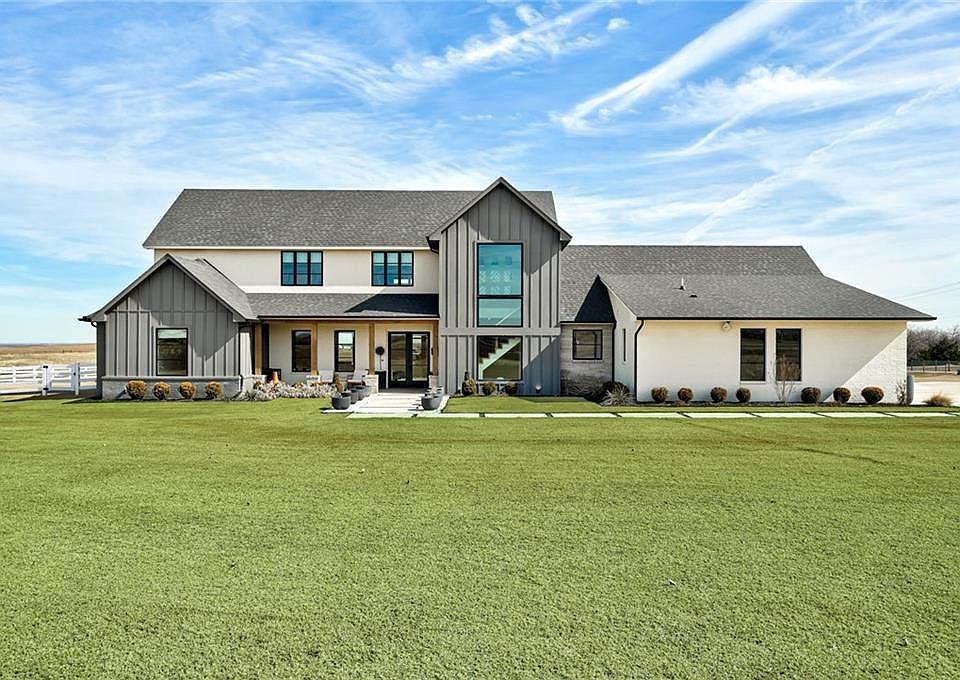 Stunning luxury Modern Farmhouse situated on 5.33 acres. Craftsmanship, attention to detail, and functionality of the space truly makes this home special! As you enter the front door you’re immediately drawn to the wall of windows overlooking the acreage & the natural light filling the living, dining, and kitchen areas. Beautiful wood floors throughout, light tones w/accents of color. The kitchen is an absolute show stopper! Cafe’ line appliances, wrap around Quartz countertops, beautiful center island, hinged picture window opening to screened back patio and a spacious pantry. Primary bedroom down w/access to back patio. En-suite features detailed glass display cabinetry, large walk-in closet, soaking tub & shower. Upstairs offers a large open bonus room, 3 guest bedrooms with Jack-n-Jill access for two of the rooms & third room with private en-suite. The home also features a downstairs study/craft room, built-in desk space, half bath, laundry room, and storm shelter.