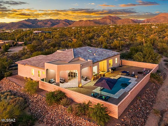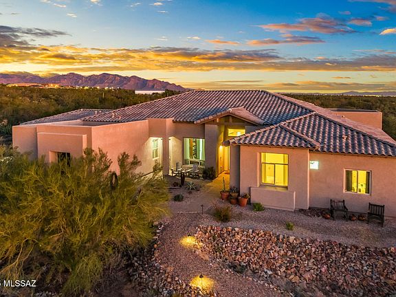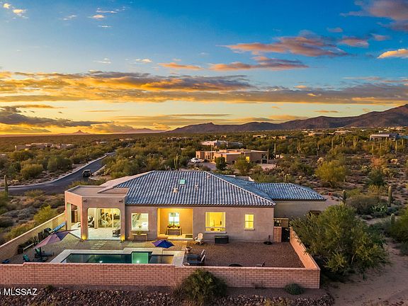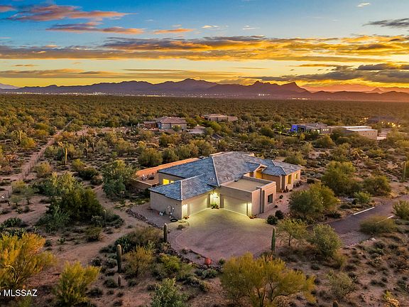 Welcome to this exceptional AF Sterling contemporary home, nestled on a sprawling 2.6 acre lot in Garden Estates, a prestigious gated enclave of just 25 custom residences adjacent to Dove Mountain. Built in 2019, this stunning 4Bed+Den/4Bath main home combines sophisticated design, seamless functionality, and breathtaking desert surroundings for a truly elevated living experience. The attached 1Bed/1Bath Guest Casita, with its own private entrance and living area, provides comfort, privacy, and versatility for visitors, extended family, or even a home office - bringing the total to 5 bedrooms and 5 bathrooms in this spacious estate. Step inside to discover soaring 12-foot ceilings, wood-look ceramic tile flooring, and a neutral designer palette that enhances the home's open, light-filled layout. Perfect for both intimate family living and stylish entertaining, the expansive great room effortlessly flows into a chef's dream kitchen featuring a massive quartz island, abundant cabinetry, glass tile backsplash, gas cooktop, double ovens, and an oversized walk-in pantry ready for your largest Costco run. The luxurious primary suite offers a serene retreat with large picture windows and a spa-inspired bath complete with a soaking tub, walk-in shower, double vanities, and a generous walk-in closet. Two additional bedrooms share a full bath, while a fourth bedroom boasts an en-suite bath and private closet-ideal for guests or multigenerational living. Step outside to your own desert oasis. The backyard features a Pebble Tec pool with dual lagoon shelves, a covered patio, and ample space for outdoor enjoyment, all set against a backdrop of mature saguaros, sweeping mountain views, and stunning Arizona sunsets. Additional features include dual two-car garages, panoramic views, and access to world-class golf and recreation. Just minutes away, you'll find The Gallery Golf Club and the Golf Club at Dove Mountain, home to a 27-hole Jack Nicklaus-designed course and the luxurious Ritz-Carlton Resort. With its rare blend of privacy, elegance, and proximity to premier amenities, this extraordinary property offers a lifestyle unmatched in Tucson.
