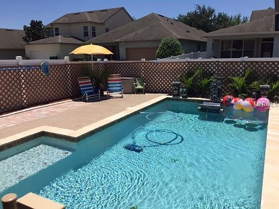 Enjoy the AWESOME community at the Lakes of Windermere. This 4 BEDROOM & 2 BATHROOM home with POOL and partial screened rear PATIO will make your family SMILE. The WOOD FLOORS are absolutely fantastic. The KITCHEN is well appointed with GRANITE COUNTER TOPS, STAINLESS APPLIANCES and 42 inch CABINETS. Enjoy your FLORIDA STYLE ROCKING CHAIR front PORCH on this quiet community street. The BACKYARD POOL will be a welcome relief on a hot SUMMERS day. The POOL comes equipped with a SWIM TRAINER and has a lovely deck for SUN & FUN. POOL is 9000 gallons, SALT SYSTEM, heater & electric control panel with JETTED swim out seat, THINK HOT TUB. TRAVERTINE edge and self cleaning jets. FAST LANE swim system. Pool is less than 3 years old. The MASTER BEDROOM is split from the other rooms and includes, DOUBLE SINKS, GARDEN TUB and separate SHOWER. The KITCHEN opens up to a dinning and FAMILY ROOM with a great view of the your POOL. There is a 2 car GARAGE with a PARKING PAD. There are 2 ATTIC STORAGE area's. The upscale community in WINDERMERE includes community pool, FISHING PIER, tennis/sand VOLLEYBALL courts, basketball field, PARK and playgrounds. The home is located close to schools, dinning, shopping, DISNEY WORLD, SR 429, Fla Turnpike and I-4. Lots of CROWN MOLDING and UPGRADED interior paint. Community playground located down the block.