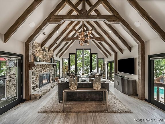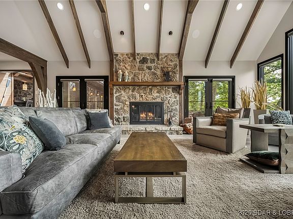 Welcome to your dream retreat. Exquisite 6-bedroom, 5 full and 2 half bath Stone and Cedar Lodge-style Home is the perfect blend of luxury, comfort, and lakeside living. Situated on 1.80 acres of partially wooded land with 280 feet of pristine lakefront, this beautifully appointed property is nestled in a tranquil no-wake cove—ideal for peaceful water enjoyment and privacy. Over 7,300 sq ft of living space, designed for both entertaining and relaxation. Vaulted great room with exposed wood beams and stone fireplace, creating a warm and inviting ambiance. Gourmet kitchen, Formal dining area, and a spacious screened-in porch make hosting effortless. Four en-suite bedrooms for Owner and Guest comfort. Lower Level has game and family room, fitness space, full wet bar and the hidden cigar and wine room—a unique touch. Step Outside to a Pool, Hot Tub, large concrete Dock, and Lakeside Patio. The three-car attached garage provides ample storage for vehicles and lake toys. Fully furnished, extensively remodeled in 2020 and 2024, and immaculately maintained, this turn-key lakefront property offers a rare opportunity for year-round living, a weekend getaway, or an upscale vacation rental.