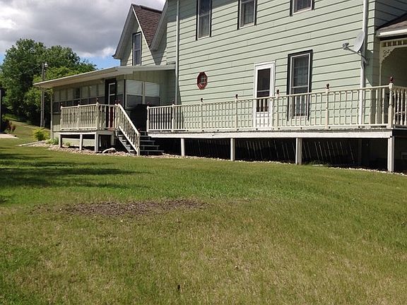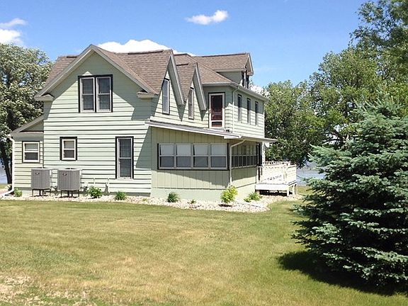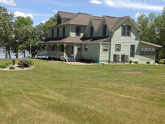 Six bedroom Victorian lake home on Big Stone Lake, South Dakota. This property consist of 225 feet of lake front, with a two story home that has been moved in and placed on a full walkout basement. The main floor woodwork was removed and stripped and refinished. All the doors frames and windows are the original oak woodwork. Four of the main floor windows have stained glass panels The dining room floor is unique with mitered pattern of light oak with darker wood strips. All of the doors are oak, with two pocket doors. Custom kitchen cabinets with island. Laundry room is off the entry way, and has a full bath with soaking tub. On the second has Anderson windows that tilt in for cleaning. Most of the woodwork has been painted. Closets were built in the bedrooms. Bathroom with walk-in shower. Several of the light fixtures are original with updating wiring. The sun porch is finished with knotty pine. Wood decks wrap around the house on three sided. The unfinished attic is in good condition. The poured concrete basement is under the entire house with a large rec room that walks out onto a 12x32 concrete patio. This is overlooking the lake front. There is also is a large shop and bath. The pole building has poured concrete floor. Three overhead doors with garage openers. Large generator in building to supply electricity in case of power failure. The beach front is gently sloping sandy beach. Dock is included to catch some of those walleyes that Big Stone Lake is noted for. This site is quite isolated with mature trees. This house has been completely restored. This is a very unique property that the owners restored for their own use. A property like this seldom comes on the market.SOLD