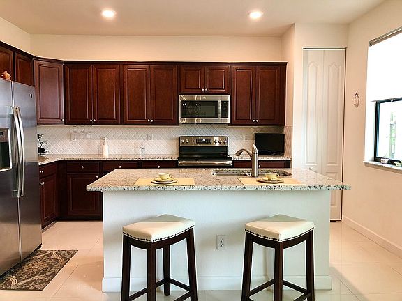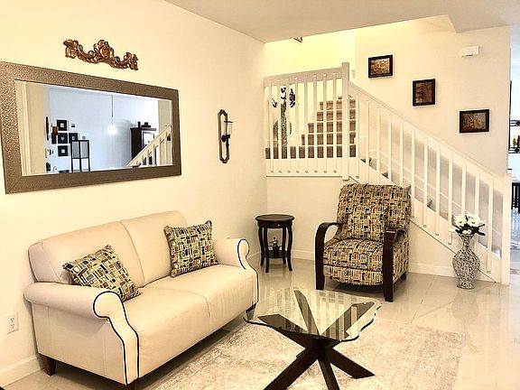 This stunning home just 10 minutes from the beach is a new townhouse built in 2017 located in a gated community in Boynton Beach, FL. Its modern layout includes 3 bedrooms, 2.5 baths, 1 car garage, and a total of 1,828 sqft built on a premium lot with serene water and fountain views. The spacious master bedroom with a peaceful pound fountain view has a vaulted ceiling and a large walk-in closet. The master bathroom has a double sink wood-finish vanity with a granite countertop and an extra-large shower with floor-to-ceiling tile. The laundry room includes a GE large capacity W/D. Gorgeous 24” polished porcelain tile on the first level, living room, 1/2 bath, storage room, family and a dining room. The spacious kitchen has a custom backsplash, granite countertop, center island, and modern wood finish cabinets with 42” uppers. It is equipped with all GE stainless appliances. This property has several smart home features including a keyless entry, Ring doorbell with camera, Nexia app-controlled thermostat, and a security system. Other great features are 9” high ceilings, hurricane resistant impact glass windows and doors, automatic garage door opener with remote, brick paver two-car driveway, and a beautiful backyard view of the community pond and lighted fountain. Thoughtful upgrades throughout this house make this a must see! The new community of Cambria Parc has several family-friendly amenities including a gated entry, a beautiful swimming pool, a children's playground, green areas with a recreational path, gazebo, park benches, and tropical lush landscaping throughout. Conveniently located close to all your shopping needs, and just a few minutes' drive to the best restaurants, stores, nature preserves, and beaches in South Palm Beach. Low HOA monthly fee.