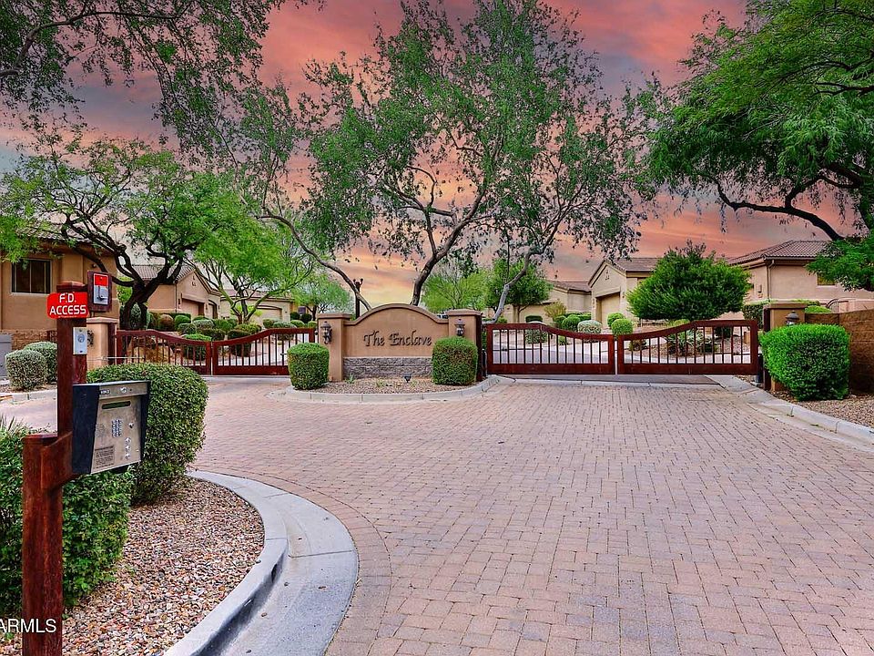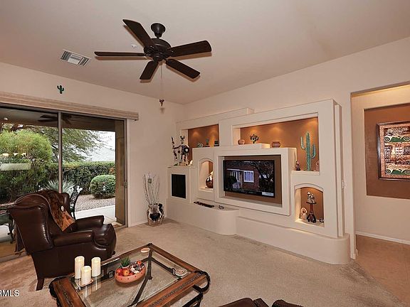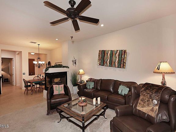 This stunning home is located in the highly desirable Gated Enclave community, within walking distance of the World-Famous Fountain, Park, Shops, Dining, Library, and the new Dark Sky Discovery Center. Enjoy a resort-style living experience with a sparkling community pool and spa just steps away. The spacious floor plan has NO steps, soaring ceilings, a 3-way gas fireplace, and a custom entertainment center. Two ensuite bedrooms offer premium plantation shutters. You'll enjoy the tranquility and privacy of the spacious backyard with mature landscaping and covered patio. Recent upgrades include a newer Trane HVAC unit, roof and carpeting.