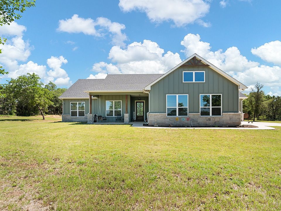 Beautiful Modern Farmhouse sitting on 2 tranquil acres with board and batten and stone accents. This custom home offers a great front porch perfect for a swing to enjoy the outdoors. The pretty front door gives access to a spacious entry area for greeting guests. Once inside the home you will love the bright and open floor plan. The living room features a stone fireplace matching the exterior of the home and is a great size for hosting family and friends. The well appointed kitchen features a large island with granite countertops, a farm sink, and custom cabinets. The gas range is perfect for cooking and has a pot filler and the tile backsplash is gorgeous. The kitchen also has a walk in pantry and a built in coffee bar. You will love the kitchen colors and the wood vent. The primary bedroom has a vaulted beam ceiling and is generously sized. The spa like bathroom has dual vanities, a large soaking tub, and a great walk in shower. The bathroom has a lot storage and the walk in closet is fabulous. The primary closet has direct access to the laundry room for your convenience. The three guest bedrooms are all a great size and have walk in closets. The guest bathroom features dual vanities and a tile surround private bath area. There is a mud bench at the garage entrance to help keep you organized. The two car garage is a great size and there is a single car attached garage with a 220 plug. If this is not enough, the backyard has a large patio for entertaining and a huge fence in dog area. There are so many details in this home, you will not want to miss this one. This home is also priced below the most recent appraisal.