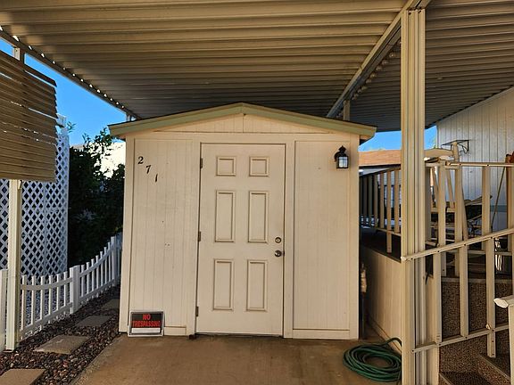 Lovely Park Model set in Mountain Shadows RV Resort a 55+ gated community. Turn key ready. HOA fees include water, sewer, garbage, cable tv, and internet. Comes furnished with propane stove, electric refrigerator, washer, dryer, reclining sofa and chair, and adjustable bed w/massage. Fully covered carport and deck w/outdoor furniture. Fenced in back yard for your pets. Has new roof, new hot water tank, updated light fixtures and faucets. Mtn. Shadows RV Resort has 2 clubhouses, pool, 2 hot tubs, billiards room, shuffle board, puzzle and game room. Lots of activities.