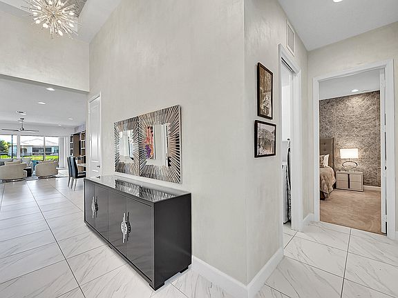 This 3 bed 3 full bath plus den/office pool home sits on a beautiful lake lot with direct fountain view. Barely lived in. This fully furnished home has been decorated with all high end finishes. Every window has blinds or plantation shutters. Primary bedroom and great room have remote control blinds. FULL HOUSE GENERATOR. Local artist has faux painted many accent walls. Built in wall unit with TV in great room. Custom furniture and lighting throughout, Toto toilets and mirrors to ceiling in 3 baths. Primary bath has extra cabinets. Closets are all fitted out. Epoxy garage floor. Central vacuum system. Etched glass front door. All impact windows and doors. Valencia Sound amenities include full service restaurant, pickleball, tennis,card rooms and pools. 24 hr manned gate. Move right in.