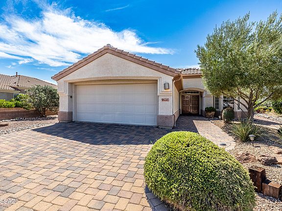 Beautiful golf course (7th tee boxes) & mountain views at this extended Hillsboro model. Extended laundry room & oversized den/office + extended dining area w/bay window. Guest bedroom also has bay window. Kitchen has lovely granite counters & stainless appliances. Lovely modern stacked-stone fireplace front - floor to ceiling. New roof underlayment installed roughly 2 years ago. HVAC systems replaced 1 year ago. Expansive brick paved patio/porch area w/outstanding views. Center post has been removed to enhance panoramic views. In 2024 all window screens were replaced. In 2025 drip irrigation box & valves all replaced. New wood-look flooring added in den/office. Home is well maintained. One of the most popular models - nicely extended - great views - new roof - new HVAC! Great Value! Other great features is wide brick paved driveway, solar screen on rear porch, built in BBQ, expansive laundry folding station w/utility sink in laundry room.
