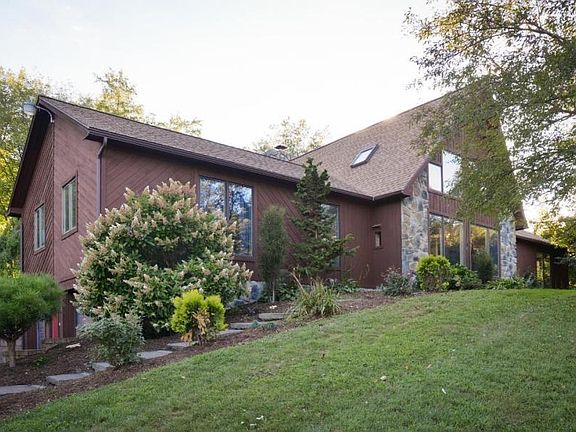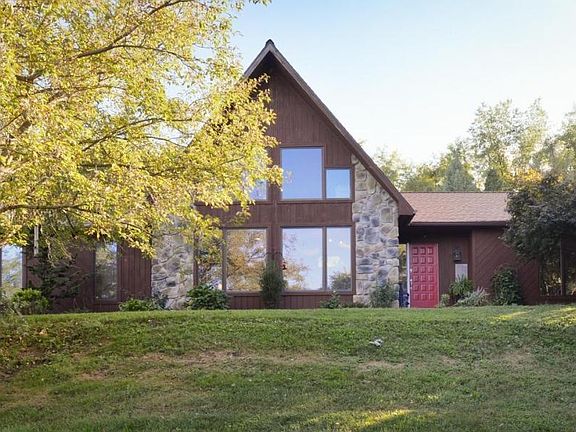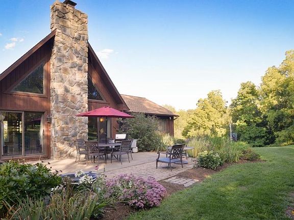 BEAUTIFUL VIEWS! Updated contemporary with hickory hardwood floors, kitchen with stainless steel appliances and granite countertops. Great room with cathedral ceilings and floor to ceiling stone fireplace, spiral stairs lead to a loft area. Just relax and enjoy the privacy on your patio with Koi pond and waterfall surrounded by 4.74 acres. Newer high efficiency Trance head pump and central air.