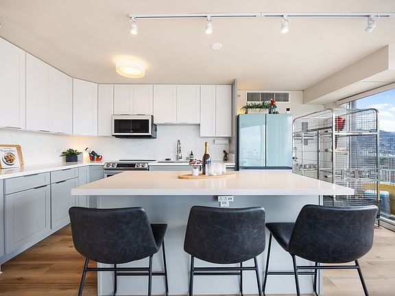 Functional kitchen islandSpacious unitFloor-to-ceiling windowsOpen kitchen layoutCentral air conditioning