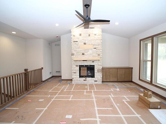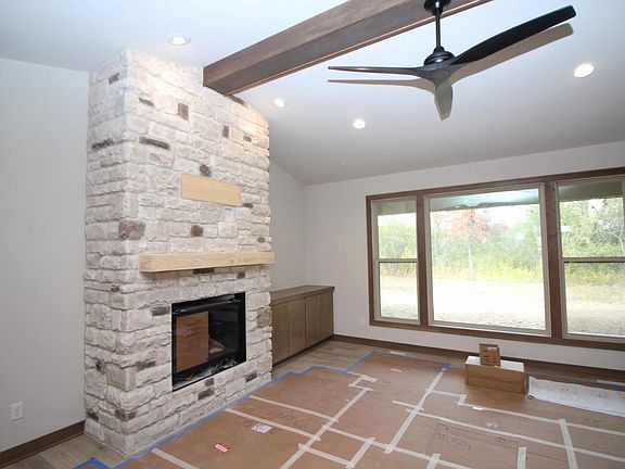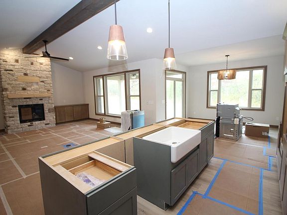 Quartz countertopsKohler apron sinkStunning kitchenWalk in pantrySpacious great roomStained beamStriking fireplace
