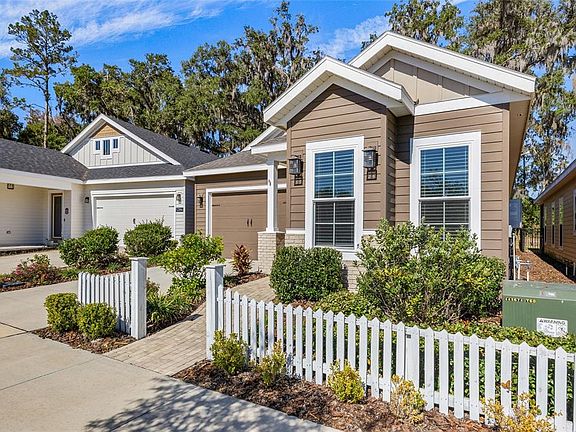 One or more photo(s) has been virtually staged. Welcome home to this turn-key 3 bedroom / 2 bathroom that backs to green space with a 1.5 car garage nestled in the sought-after community of Fairway Pointe. Step inside to a light and bright open floorplan, where the great room is enhanced with a trey ceiling highlighted by crown molding and luxury vinyl plank flooring throughout the main living areas. The separate dining area flows seamlessly to the well-appointed kitchen, showcasing granite countertops, stainless steel appliances, gas stovetop, a stylish tile backsplash, soft-close cabinetry, large pantry for all your culinary needs and functional island with breakfast bar for additional seating. The split bedroom layout offers privacy and comfort, with a spacious primary bedroom boasting an extra-large walk-thru closet and direct access to the lanai. Stepping into the en-suite primary bathroom you'll be greeted by double vanity with granite countertop, walk-in shower with built-in niche for all your products, private water closet and linen closet. Bedroom two and three both have wall closets and the conveniently located secondary full bath features vanity with granite countertop and tub/shower combo. Bring the outside-in when you open the French doors to lanai overlooking green space. Laundry room features washer/dryer with built-in cabinets with folding area and the 1.5 car garage provides attic access for all those seasonal items. HOA includes internet! Enjoy the amenities offered at the clubhouse with weekly activities and programs, pool and tennis/pickleball courts. Located just minutes from grocery, entertainment, dining, medical and Gainesville.