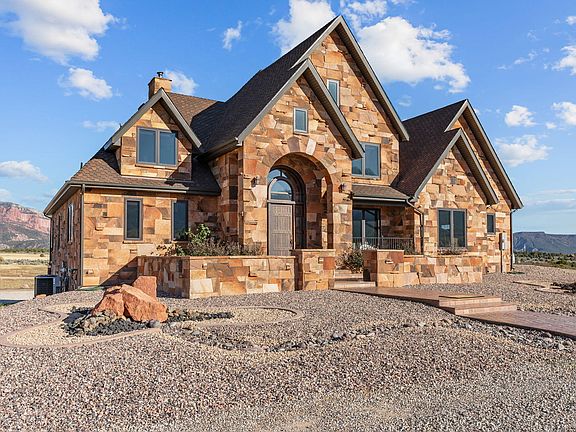 **Custom Built Stone House with Spectacular Views** Only 20 minutes away from Zions National Park and features breathtaking unobstructed views of the Kolob Fingers to the East. Welcome to your dream retreat—nestled on a sprawling 20 acres of pristine landscape, this custom-built stone house offers an idyllic blend of luxury and nature. With 5 spacious bedrooms plus a versatile bonus room upstairs, this home is perfect for families or those seeking ample space for guests. Experience stunning views of the majestic Kolob Fingers to the East as well as the majestic Pine Valley Mountains to the North and the Black Ridge to the South, providing a picturesque backdrop for any occasion. Enter through a grand foyer featuring elegant travertine tile flooring and an inviting atmosphere. The open layout seamlessly connects each area, creating a harmonious flow from room to room. Enjoy the warmth of two wood-burning fireplaces and one gas fireplace located in the master bedroom, perfect for cozy evenings spent relaxing at home. The kitchen the heart of the home boasts granite countertops and rich cherry wood cabinetry. The spacious island provides ample room for meal preparation or casual dining, while high-end appliances make cooking a pleasure. Retire to your Luxurious Master Suite bedroom that features a private gas fireplace and a sumptuous soaking tub in the ensuite bath, perfect for unwinding after a long day. The upstairs bonus room offers endless possibilities use it as a playroom, office, or personal retreat, catering to your unique lifestyle. Expand your living space with a fully finished basement, ideal for entertaining, storage, or transformation into a home gym or theater.