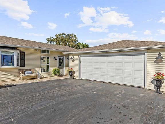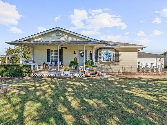 Beautiful unobstructed skyline views of town, a mini split installed for additional comfort. Luxury vinyl plank floors throughout the home! So many extra features: Granite counters, recovered wood from an old STL church adorns the kitchen as shelving, quiet close drawers, 2 bay windows that let the light right in, Lg. dining room to seat plenty, inviting open style covered front porch, flat front yard, paved driveway, a quaint trellis, a tuck under off the sun room can be turned into a cabana area with curtains/shades or extra play area (whatever your desire to create), Pergola can be strung with darling lights and set the ambience for an evening; the walk out basement also includes extra "bonus rooms"; washer/dryer, water softener, couch in basement, swing set and trampoline all will stay. The garage has 4 car parking, 2 lower and 2 car main level both with concrete floors. Much to love in this home, it even comes with a home warranty plan already purchased for the buyer.