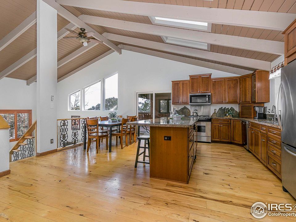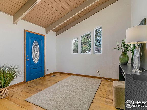 Private and serene mountain living in coveted Pine Brook Hills neighborhood, conveniently located less than 1.5 miles to Broadway! Upon entering, you will find a welcoming foyer that leads to a large light-filled kitchen and dining area with soaring vaulted ceiling and skylights. Enjoy a partially enclosed and covered patio off of the kitchen to take in the stunning views. A full bathroom completes the main floor. Up a short flight of stairs, you will find one of the 4 bedrooms complete with an en suite bathroom. From the kitchen/dining area, head down a small flight of stairs to access an airy den complete with a fireplace and beautiful windows. On the lower levels, you will find an additional bathroom plus 3 bedrooms. The spacious walkout basement with wood burning stove is currently being used as the Primary Bedroom, but the options are endless. So much opportunity in this well loved home!