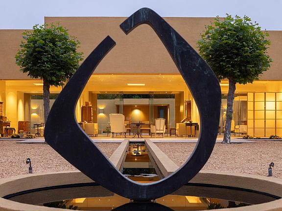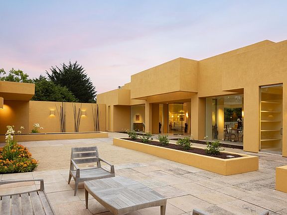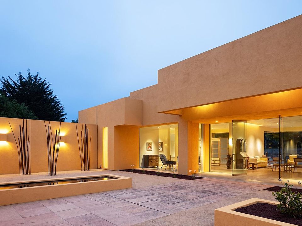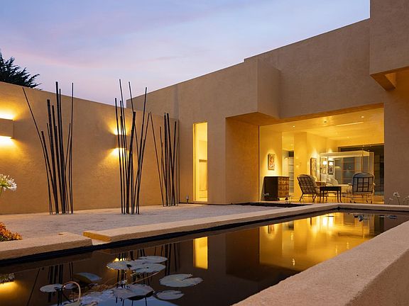 Tucked into a private 1.8 acre parcel in the heart of world-famous Pebble Beach sits a wonder of modern design. Conceived and drawn by the owner, the minimal cubist-style home enjoys a private setting surrounded by trees and flush with natural light. The 2,540+ square foot home has an open floor plan surrounded by nine and a half foot glass walls that look out onto a spacious interior courtyard and exterior gardens with reflecting pools thoughtfully positioned to provide a calming, reverent ambiance for both the interior and exterior spaces. French limestone floors and smooth Venetian plaster walls exemplify the simple elegance envisioned by the owner. While currently a one-bedroom two bathroom configuration, there is space to easily create additional bedroom suites. Other highlights include radiant heated floors throughout, an open spa-like primary bath, a well-appointed garage, hidden rooftop solar panels, and the striking sculpture at the rear of the property that is seen from the moment you walk through the front entrance. With all the amenities of The Lodge and resort just around the corner, this completely unique Pebble Beach residence is ready to welcome the sophisticated style of its new owner.