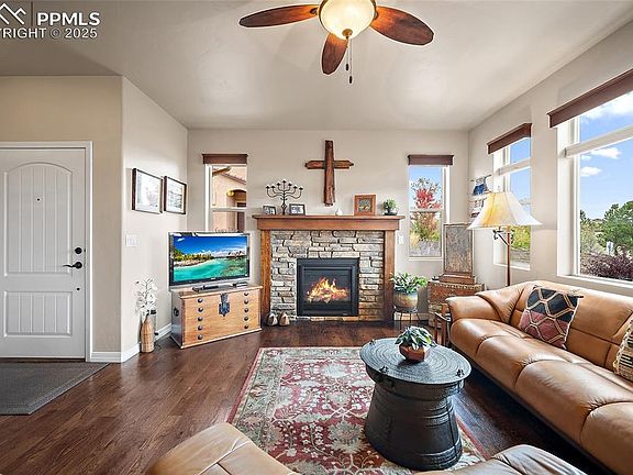 Experience refined main level living in this beautifully appointed patio home nestled within the prestigious Flying Horse community. Every detail has been thoughtfully designed to create a welcoming sense of warmth and ease. The kitchen features rich cabinetry, granite counters, stainless steel appliances, and an expansive island that connects seamlessly to the open living area. The living room is both elegant and inviting with a stone surround fireplace, hardwood flooring, and soft natural light that fills the space. The primary suite offers a peaceful retreat with dual vanities, a frameless glass shower, and a spacious walk in closet. A second main level bedroom offers flexibility for guests or a home office. Downstairs, the finished lower level is warm and cozy with a second fireplace, a spacious family room perfect for movie nights or gatherings, two additional bedrooms, a full bath, and plenty of storage. Step outside to the covered patio with remote controlled shades and take in views of Pikes Peak. Whether it is morning coffee or evening sunsets, this space invites you to slow down and enjoy the view. Tucked in the heart of Flying Horse and just minutes from I-25, the Air Force Academy, and the new King Soopers Marketplace, you’ll find everyday conveniences, dining, and local favorites all nearby while still enjoying the peaceful, resort style setting that makes this community so special. Enjoy a true lock and leave lifestyle with exterior maintenance and landscaping handled by the HOA. Living in Flying Horse means access to golf, dining, fitness, pools, spa, tennis, and trails within one of Colorado Springs’ most desirable country club communities. Memberships are available separately through The Club at Flying Horse, allowing you to enjoy the full resort style experience at your own pace.