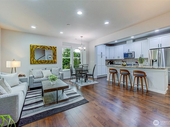 Charming corner townhouse at Sunset Walk in the heart of Issaquah Highlands. Walk to restaurants, movie theater, parks, and shopping. Open concept great room with hardwood floors and inviting kitchen featuring a large island, painted wood cabinets, stainless steel appliances, and ample storage. Spacious primary bedroom with a large bathroom and walk-in closet. Smart features include automated lighting, locks, Nest thermometer, MyIQ garage door, and some switches. Updates include newer A/C, new interior paint and new water heater. 2 car garage with access in back. Great Issaquah schools. Easy access to I-90 and just minutes from downtown Bellevue and Seattle.
