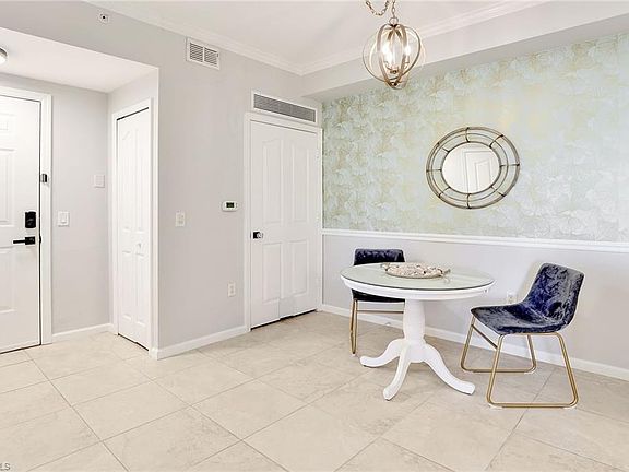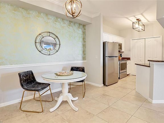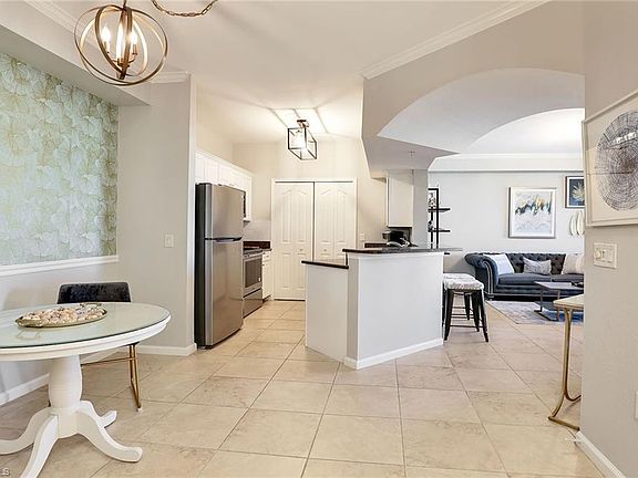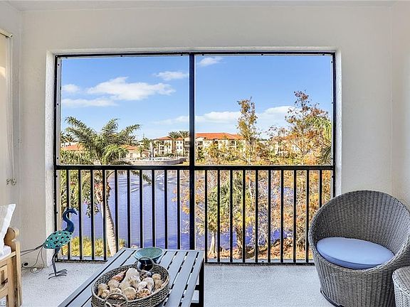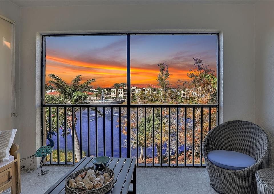 Beautiful lakefront retreat with the most beautiful sunsets! This third-floor residence in Positano Place offers a serene, palm-lined lake view with a sparkling fountain — the ideal backdrop for seasonal or year-round Naples living. Designed with comfort and style in mind, the open great room floor plan features tile flooring throughout, a wall of sliders leading to the screened lanai, and a built-in granite desk. The kitchen includes a breakfast bar, stainless steel appliances, and a convenient in-unit laundry closet. From the lanai, enjoy glowing northwestern sunsets over the water, creating a peaceful retreat to begin and end your day. Positano Place is a gated community with resort-inspired amenities, including a lakeside pool and jacuzzi, fitness center, bocce, playground, billiards room, media lounge, executive business center and an outdoor sports bar with TV. Additional conveniences such as a car care facility and community room with kitchen enhance everyday living. Just minutes from Interstate 75, the upscale shopping and dining of 5th Avenue South and Mercato, and pristine Gulf beaches, this residence combines lifestyle and location in one of Naples desirable communities.