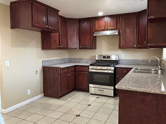 Inside, the home features durable tile flooring throughout, offering a clean and easy-to-maintain living environment. The large living room provides ample space for relaxing or hosting, and the adjoining dining area leads to a bright kitchen with sparkling granite countertops and beautiful wood cabinetry.