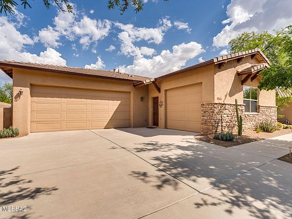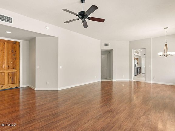 Nestled in the highly desirable Bluffs at Dove Mountain, this 2,301 sq.ft. home stands out as one of the few in the neighborhood crafted with block construction. Designed with a split-bedroom, open-concept floor plan, it offers the perfect balance of privacy and togetherness, all set on a .43-acre private lot embraced by natural desert beauty and mountain views.Inside, a spacious living room welcomes you with warm wood-look laminate flooring and window walls that flood the space with natural light. A glass slider opens to the rear patio, creating a seamless connection to the outdoors. Alongside, the formal dining area features a bay window that frames the picturesque desert views, providing a beautiful backdrop for memorable gatherings. Throughout the home, fresh paint in a soft, neutral palette, oversized windows, and solar tubes keep the space bright, airy, and inviting.