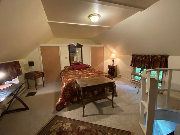 1893C Charming Carriage Barn with many updates through the years. 2 BR & 1&1/2 Ba. Sturdy circular staircase to give access to a Bedroom and bath on the upper level and a BR and bath on lower level. Cozy living room with slate fireplace and a brick fireplace on lower level. Sweet deck off the dining area with built in seating and covered deck. Time for a barbeque or perhaps just relax. .03 Acre which is where the house sits with very little front yard, No lawn to mow. 18' ROW from street through the left side of parking area. Very old cemetary at rear of house with very quiet residents. (Smile.) Very affordable at $139,700