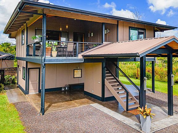 This house was built by a master craftsman with an attention to detail evident throughout the home. The main living area is on the second floor which takes advantage of the views and the trade wind breezes. Sitting on your spacious front lanai during an early morning will allow you to experience an incredible Hawaiian sunrise along with the beauty of your gardens. Enter the home through the custom 7’ Wenge pivot entry door into the open beam, kitchen and living areas. This kitchen boasts custom-made, European frameless bamboo cabinetry, granite countertops, kitchen island with bar seating plus black stainless steel appliances. The cozy living area has a custom floating media entertainment center just below the 70 inch Samsung TV. There is a guest bedroom and bath along with the primary suite and bathroom rounding out the upstairs.