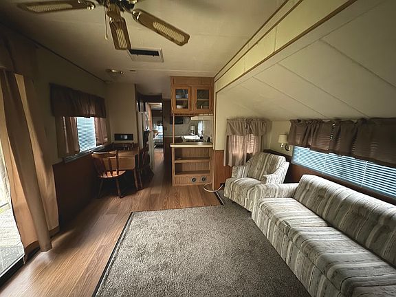 This spacious, pie-shaped lot is located in a cul-de-sac and offers great potential! The property is connected to sewer and includes a well-maintained 1990 American Travel Trailer. Inside, you'll find brand-new flooring, with fresh carpet in the bedroom and living room, and stylish vinyl wood planks throughout. The unit is generously sized, offering plenty of storage space. The lot also features a fire pit, firewood, and a shed. This turnkey package is ready for you to begin your next adventure at Woodhaven Lakes! Contact us today to schedule a showing! Please note that Woodhaven Lakes is a gated recreational community and cannot be used as a primary residence or homestead. You must be accompanied by a broker to view any properties, YOU CANNOT ACCESS THE CAMPGROUND WITHOUT A PASS. Property owner pays the association fees.
