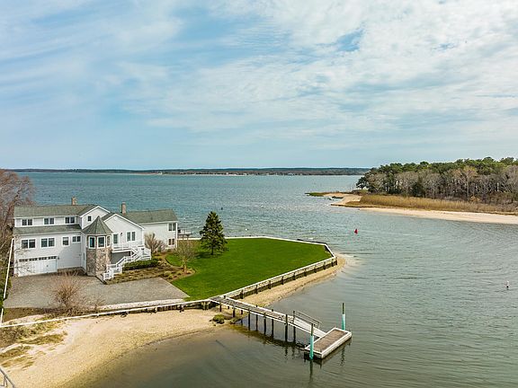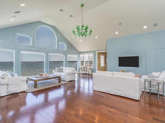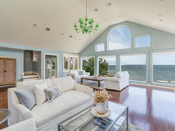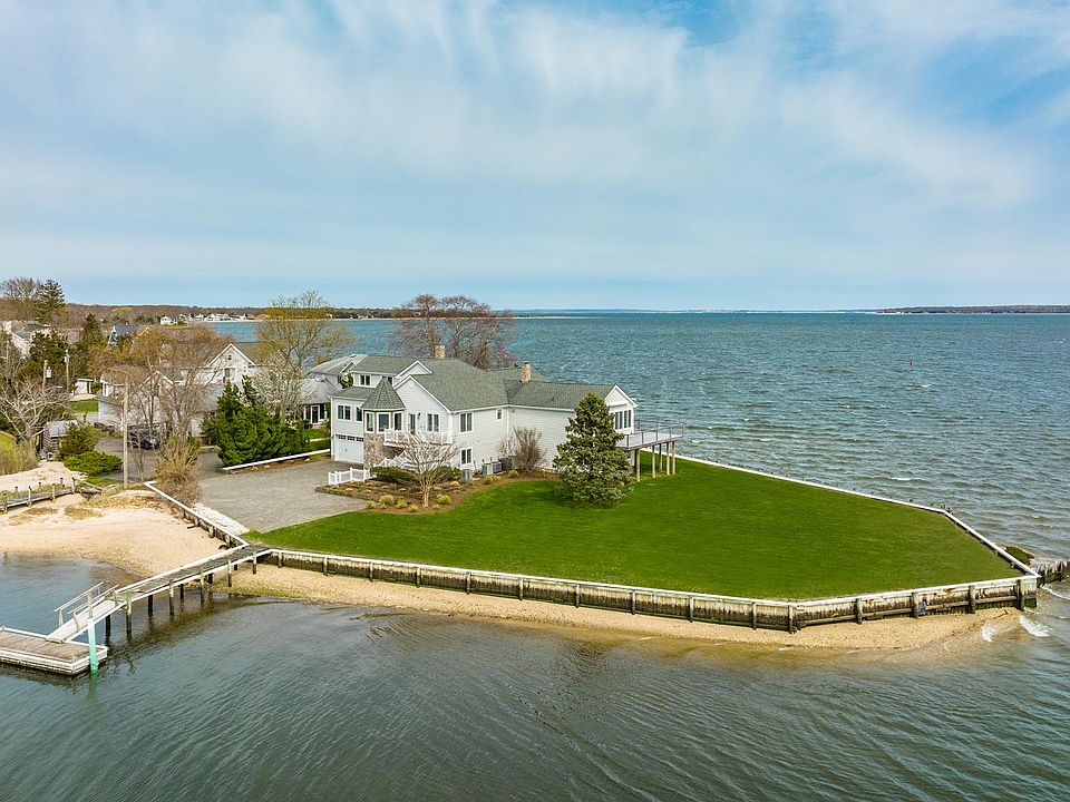 One of kind North Fork Dream Home on Swan's Point in Aquebogue! Enjoy breathtaking sunsets and panoramic water views from this stunning post-modern home. This home is situated on its private peninsula at the end of a beachy street. 424 ft of waterfront, surrounded by the bay and the creek with a private deepwater dock you can have it all! The large primary is en-suite with a jacuzzi tub, marble shower, and double vanity. 3 additional guestrooms with 4.5 baths. The main house is 3500sf with vaulted ceilings, floor-to-ceiling windows, an open floor plan, and hardwood floors throughout. Gourmet kitchen with high-end appliances and huge deck overlooking the water for an un-matached dining experience.. Open, airy, and dreamy views from every room and multiple balconies. Truly a unique offering not to be missed!