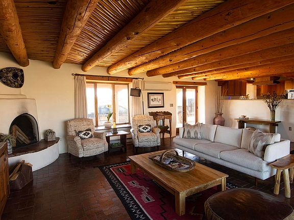 Outdoor fireplaceIncredible mountain viewsTwo indoor kiva fireplacesAttached two-car garageAuthentic brick floorsStunning adobe homeFire pit