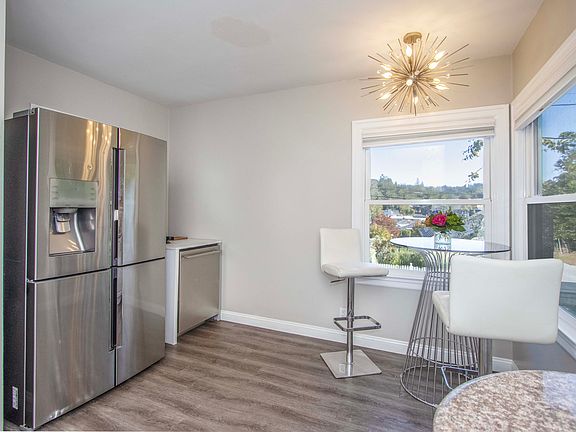 The home has a stunning kitchen, boasting sleek stone countertops, abundant cabinetry, and top-of-the-line stainless steel appliances, including a Thermador gas stove with a double oven. A cozy breakfast nook provides the perfect spot for morning coffee. The open-concept dining and living area is ideal for entertaining, highlighted by expansive windows that flood the space with natural light and marble-faced gas fireplace that adds warmth and style.