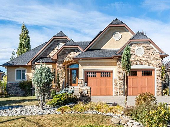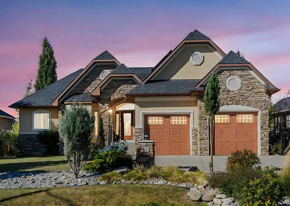 Welcome to Cimarron Estates, where timeless craftsmanship meets modern efficiency. This custom 1,928 sq. ft. bungalow by Lask Homes offers refined living on a 0.29-acre west-facing lot backing onto greenspace and pathways. Outfitted with 19 solar panels, this residence delivers sustainable luxury in one of Okotoks’ most sought-after communities. The exterior is exceptional, featuring acrylic stucco with a full-height stone façade, a covered cedar-lined front porch, and professional landscaping designed for lasting beauty. Flagstone pathways wind through manicured gardens, leading to a tranquil pergola retreat. A full irrigation system keeps everything lush. At the back, a full-width Duradek deck spans the home, complete with retractable screens, cedar-lined ceiling, and a striking outdoor fireplace with full-height stone surround—an entertainer’s dream. Inside, the grand tiled foyer is filled with natural light from the east-facing glass-panelled door with sidelights and transom beneath a vaulted post-and-beam ceiling. Brazilian site-finished Tigerwood flooring flows throughout the main level. French doors open to a private den, while the open-concept living room showcases tall windows and a gas fireplace with tile surround and maple mantle. The open staircase to the basement, framed with maple railing and wrought-iron spindles, highlights the home’s craftsmanship. The chef’s kitchen features espresso/cherry-stained cabinetry, granite countertops, a large island with breakfast bar, and stainless-steel appliances, including a wall oven, convection microwave, gas cooktop, Bosch dishwasher, and a reverse-osmosis faucet. Adjacent, the spacious dining room is ideal for entertaining, complete with a built-in china hutch for elegant display and storage. The walkthrough pantry connects to the mudroom/laundry, featuring a sink, cabinetry, shelving, walk-in coat closet, and gas and electric dryer connections. The primary suite features French doors, a tray ceiling, large windows, and deck access. The spa-inspired ensuite includes heated floors, raised dual vanities, comfort-height toilet, air-jetted soaker tub, steam shower, and a walk-in closet with built-ins and a venting window. The fully finished basement adds in-floor heating, a media area with built-ins, a wet bar with breakfast bar, flex space, and two spacious bedrooms with large windows. The bathroom includes a raised vanity and comfort-height toilet. Off the mechanical room lies a cold room with sink, cabinetry, and shelving, while the mechanical room houses the water softener, filtration system with dechlorinator, and a medical-grade furnace filter. The heated double garage includes new epoxy flooring and a separate heated workshop/storage area. Cimarron Estates combines estate-sized lots, greenspace, and pathways with convenient access to schools, shopping, the Okotoks Health & Wellness Centre, and the Sheep River Valley—offering an unmatched blend of luxury and small-town living.