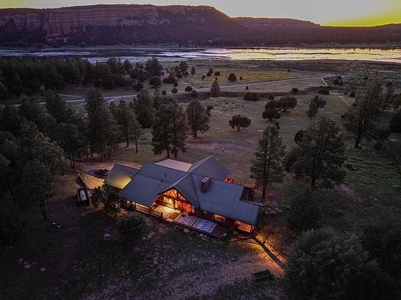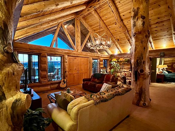 A dream home in an enchanting location! Rustic yet refined, this magnificent log cabin in the Timberlake Ranch community features hand-hewn log walls, two stone fireplaces, vaulted ceilings, and incredible views both front and back! Primary bedroom features a fireplace and a large covered patio. Open floorplan and huge patio for entertaining. Superior craftsmanship is evident throughout. Watch elk and deer right from the front porch, or head to the back patio for Dark Sky stargazing against the cliffs. Five minutes' walk to the lake trail, where you can spot osprey and bald eagles. An outdoor enthusiast's dream, Timberlake Ranch is a helpful and friendly community with a volunteer fire dept only two miles away. HOA $230/yr, roads maintained year round. Owner financing considered.