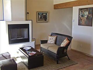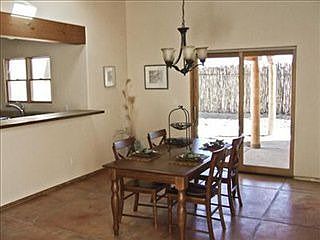 Single level green sustainable home on quite corner lots with beautifully landscaped courtyard featuring passive solar gain, stained concrete floors, superior insulation, vigas and fireplace. In Oshara village a green sustainable community that mandates energy and water conservation while increasing comfort; just minutes from schools & shopping.