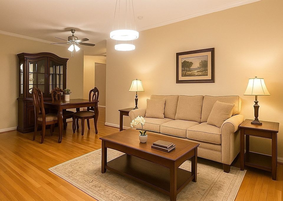 Seize this rare chance! Beautifully updated and meticulously cared for, this home in the coveted 55+ Dallas Park community combines style, comfort, and ease. Bright and inviting, it features shining hardwood floors across the living, dining, and kitchen areas, highlighted by crown molding and elegant wainscoting in the dining room, with plush newer carpeting in the bedrooms. Stay comfortable year-round with brand-new heating, central A/C, and ceiling fans in every room. The smart layout includes a separate laundry room and a private balcony with serene views of landscaped grounds. Freshly painted in a timeless neutral color scheme, the residence also provides deeded garage parking conveniently located near the elevator. Perfectly situated within one of the community’s most desirable locations, this special property is ready to welcome you home.