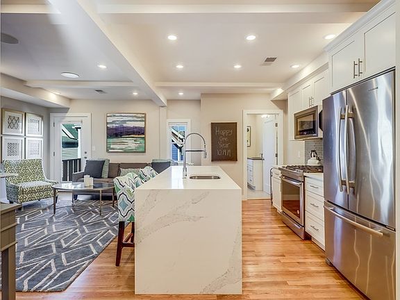 Spectacular penthouse duplex in booming East Somerville. Gut-renovated in 2018, this 2 bed/2bath top floor condo comprises nearly 1,150 sqft and offers unique architectural features, abundant natural light and lives like a single family with a private entrance. The spacious floor plan offers great separation for guests or distinct work from home spaces. The main living level features a queen sized bedroom, full bath with laundry, open living, and private deck with direct gas line for grilling. The impressive chef's kitchen is equipped with a JennAir stainless appliance package, oversized breakfast bar, contemporary quartz countertops and white shaker cabinetry. The magnificent primary suite comprises the entire top floor with access to another private deck, custom-fitted walk-in closet, en-suite bath + a perfect home office nook. Conveniently located near the much anticipated East Somerville T stop (Green Line Ext.), Sullivan Square T stop (Orange Line), Union Square and Assembly Row.