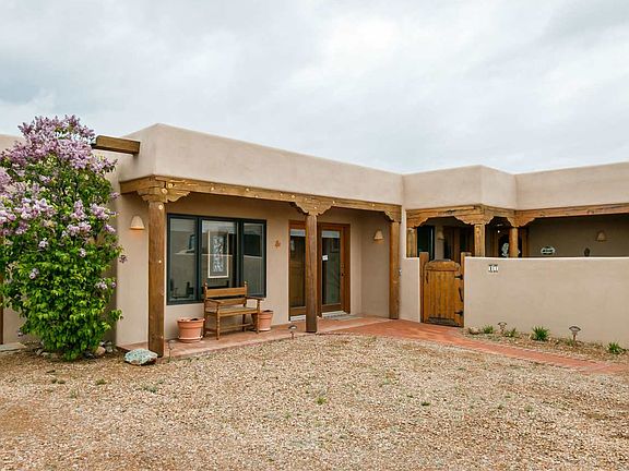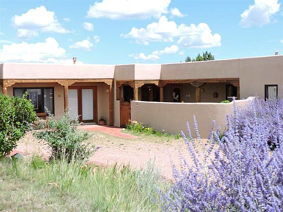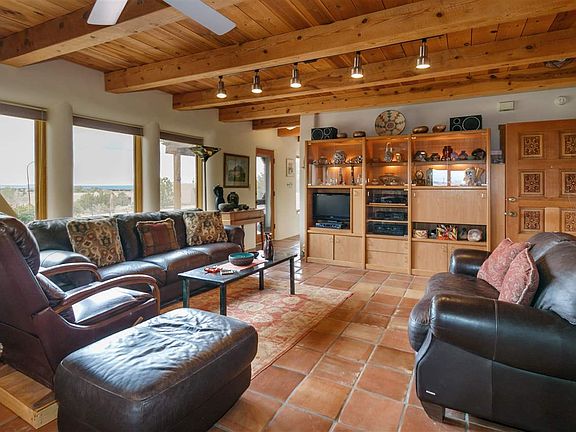 Large studio space, an office/den with separate entrance plus a large family room ideal for home office/play room was added to this adobe and frame home. Custom built by Shaylube Construction for the owner in 1998 this open plan passive solar design features natural gas, radiant heat, beam ceilings and warm Saltillo tile floors. The romantic owner's suite with kiva fireplace and the great room open onto a large walled bricked patio with shady pergola for outside dining entertainment. A huge 2+ car garage is finished and attached to the home plus plenty extra guest parking. Privately located yet with expansive views this lovely adobe & frame 2+ bedroom home sits on almost one and a half acres conveniently located close to Eldorado amenities and local shopping, library, school and senior center.