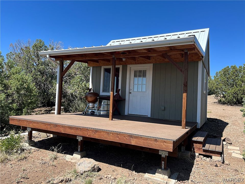 45 Acres with a well, septic, and house pad AT 5300' of elevation giving you 4 mild seasons. Ready for glamping now with a solidly-built bunkhouse with a deck and shower/bathroom shed with a quality composting toilet. There's even a separate additional deck in the trees for enjoying your coffee or cocktail with the view away from the bunkhouse. There's a 300-gallon water storage tank and a truck bed transfer tank for your campsite needs until the well is topped out. That's just what's there to enjoy today. There's also a HUGE engineered house pad with the septic location prepped and septic about to be installed, and another HUGE separate pad where the wellhead is for a future shop or greenhouse. Just under 5 miles from I-40, this quiet and peaceful view-property full of Juniper and Pinion Pine trees is still easy to get to. The roll of the land makes it great to explore with 640 acres of State Trust land adjacent to the western boundary, and a canyon on-property on the eastern side. The septic has been prepped and is in-line with the installer's schedule. Will update with anticipated completion dates as they are available. Price includes completed septic.