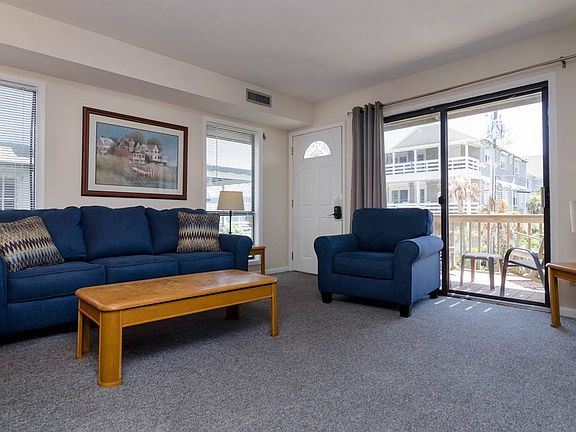 This 3 bedroom, 3 bath townhouse is less than block to the ocean front and a short stroll one block north to Johnnie Mercer's Pier. Enjoy the ocean views from both decks! The lower level features an open living/dining/kitchen area, 1 bedroom and 1 bath. Upstairs is the master bedroom opening onto a private deck, master bath, guest bedroom and bath. Outside hot/cold shower. Bedding Configuration: 1 King, 3 Queen, 1 Twin. The bunk bed was removed and replaced with a queen bed, updated photos coming soon.