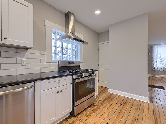 Step inside, and you're immediately greeted by stunning refinished hardwood floors that flow throughout the home. The neutral gray walls, crisp white trim, and recessed lighting create a contemporary yet warm atmosphere. The large windows fill the space with natural light, enhancing the airy, open-concept layout.The spacious living room is perfect for relaxing or entertaining, featuring built-in floating shelves and charming vintage-style curtain rods that add character without overwhelming the space.Just beyond the living area, the dining space seamlessly connects to the kitchen, ensuring an effortless flow for entertaining or cozy family dinners.
