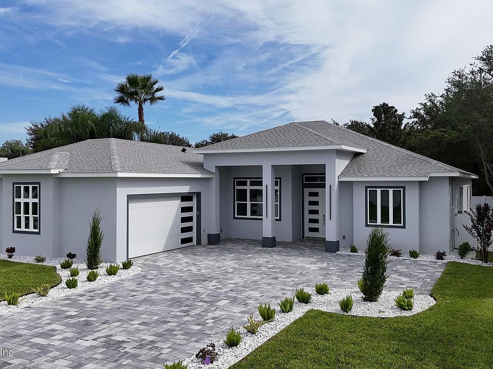 Step outside to an expansive covered lanai with pavers, a pavered patio area, and pre-plumbing for an outdoor kitchen—perfect for entertaining or relaxing. The property will be fully fenced and includes a well for irrigation. Additional highlights include a finished garage floor, paver driveway, exterior stone accents, landscaping, rain gutters, contemporary lighting, and a side-entry garage. Enjoy the freedom of NO HOA and no CDD. Close to beaches, shopping, and dining, with a short commute to World Famous Daytona Beach and Historic St. Augustine. Palm Coast offers 19 miles of uncrowded coastline, 125 miles of hiking and biking trails, 15 parks, championship golf and tennis facilities, plus excellent fishing and boating opportunities.