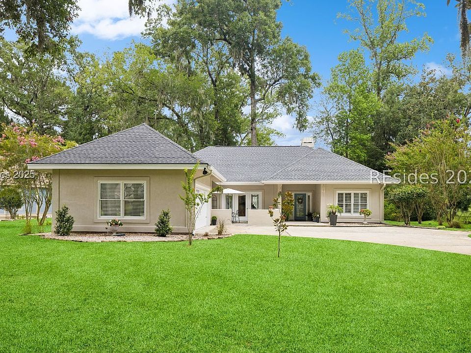 Nestled on over half an acre in the coveted Rose Hill community, this 3 bedroom, 2 bathroom Lowcountry retreat is a rare blend of privacy, beauty, and lifestyle. Tucked away behind a winding drive and framed by lush landscaping, the home welcomes you with a private courtyard, gracious covered entry and side-entry garage. Step inside to find soaring ceilings, abundant natural light, and spectacular views of the manicured golf course and vibrant wildlife. The living room features custom built-ins, and expansive windows that create a seamless connection to the outdoors. The updated kitchen boasts stainless steel appliances, gleaming quartz countertops, and a formal dining area, perfect for everyday living and elegant entertaining. The spacious primary suite offers a peaceful escape with a soaking tub, walk-in shower, and generous closet. Two guest bedrooms are positioned on the opposite side of the home, offering comfort and privacy for family or visitors. Notable upgrades include; new roof (2022), new paint, new faucets, new ceiling fans, plantation shutters, and newer glass doors leading to the rear patio. Rose Hills exceptional amenities include three pools, tennis courts, pickleball, an equestrian center, deep water access, a clubhouse, restaurant and 24-hour gated security, all in a golf-cart-friendly community just minutes from Bluffton's shops and dining.