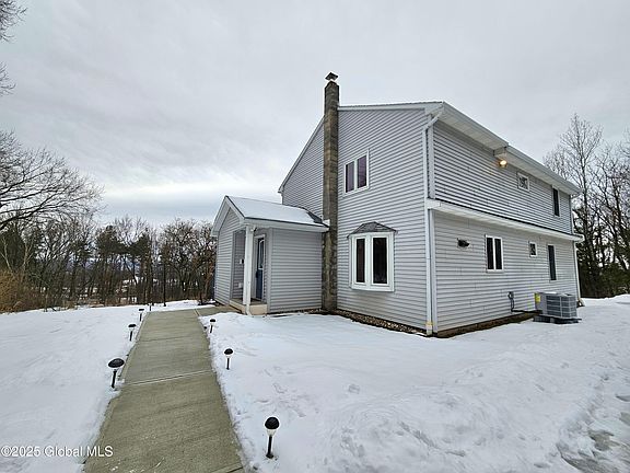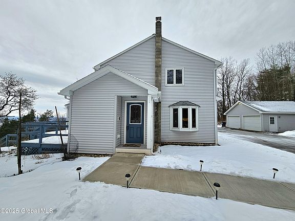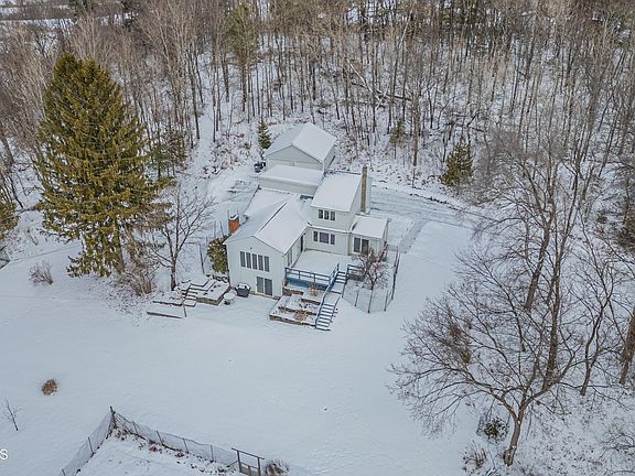 Private Retreat. Truly spectacular views! Stunning home on 4+ acres. The open concept floorplan features a large sun-soaked LRm with phenomenal views stretching for miles and a handsome brick wood burning fireplace. Spacious indeed with both a huge FDRm and gorgeous renovated eat-in kitchen. Huge butcherblock island, walk-in pantry, granite counters, SS appls, and gorgeous tile backsplash. Option of a 1st or 2nd floor Primary - both offering custom walk-in closets. Full bathrooms on both floors. Gleaming oak & bamboo flooring throughout. Stunning basement walkout Gathering Rm. Outside the huge deck and slate patio offer gorgeous views. Attractive exterior hardscaping. Detached two-car garage. Shed. This home offers privacy, stunning views, and a blend of comfort and warmth.