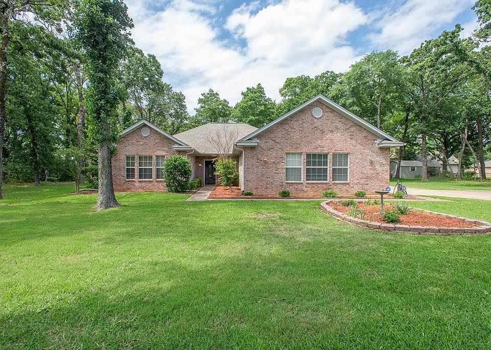 This super home is ready for its new owner! Located in the great community of Star Harbor you will have the lake, golfing and recreation right at your finger tips. Home sits on a beautiful lot surrounded by mature trees and features 3 bedrooms, 2 full baths, WBFP, eat in kitchen, formal dining area, tray ceilings and separate tub and shower in primary bedroom. Primary bedroom also has separate access to the covered back patio that overlooks a treed tranquil setting. Equipped with a storage shed and 2 a two car, side entry garage to store all your extra goodies.