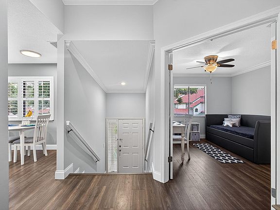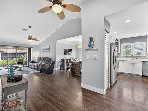 The spacious master bedroom suite boasts light and bright openness featuring a custom built-in walk-in closet, and updated master bath with dual vanities and tons of cabinets offering plenty of storage. Step out through Large sliding glass doors which lead onto the spacious screened-in lanai. The other two guest rooms are both generous in size with crown molding and the second bathroom has been recently renovated. Other upgrades throughout include a one-car garage, newer A/C, newer hot water tank, upgraded lighting, and new toilets in each bathroom.